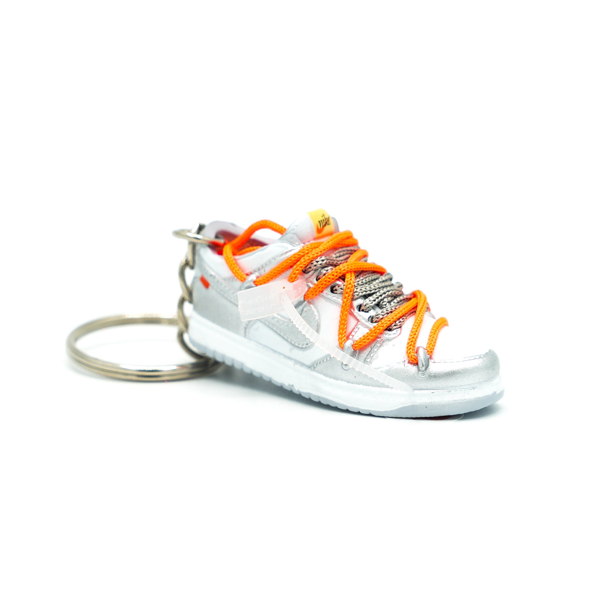 Lleva el estilo urbano contigo con este llavero 3D de la Nike Dunk Low Off-White "Silver", una réplica en miniatura del icónico diseño creado en colaboración con Off-White. Destaca por su contraste único entre el acabado plateado y los cordones naranjas cruzados, sello distintivo de Virgil Abloh. Fabricado en PVC flexible, ligero y resistente, con anilla metálica para colgarlo en llaves, mochila o bolso.
